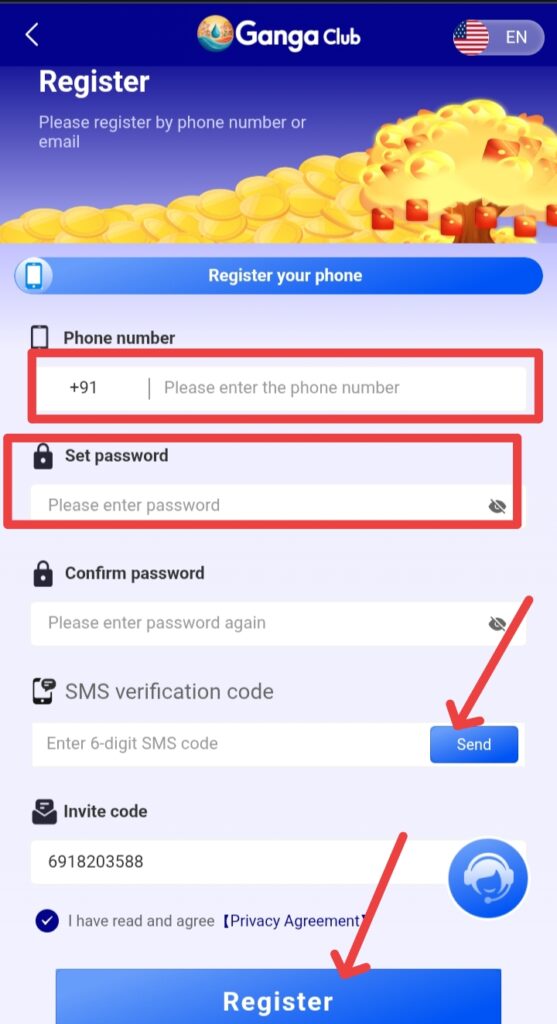 Ganga Club Open Enter Phone Number Set Password Confirm Password SMS Verification Code Enter Make Sure Invite Code Already Added Done Register.